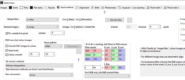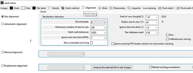 Einstellungen in ASTAP für die ALCCD5LII am 135er WalimexDer Hintergrund darf nicht zu hell sein. Das Programm kann sonst nicht stacken, obwohl das Platesolving funktioniert und nach Astrometry hochgeladene Einzelbilder im FITS Format erkannt werden - Zum Thema ASTAP habe ich im CloudyNights Forum einen Thread gestartet. Später auch noch in Sourceforge.net eine Diskussion begonnen. Hier hat sich sogar der Entwickler Han gemeldet! Die Linux- und Windows Versionen scheinen sich gleich zu verhalten. Einstellungen