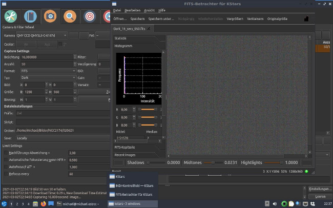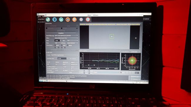 12.4.2021 – Einsatz des Linux Laptop in der Sternwarte. Hier mit aktivem Guiding. Es funktioniert auf Anhieb! Ich werde erst mal die ALCCD5LII dafür nutzen, später vielleicht eine China-Kamera, die ich bei AliBaba für 29,-€ bestellt habe.