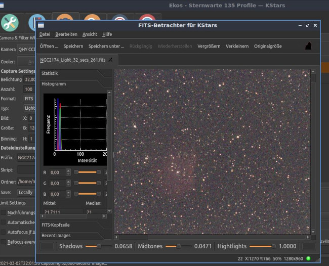 Einstellungen für die ALCCD5LII an EKOS Nach einigen Experimenten habe ich gelernt, das Histogramm zum Ermitteln der richtigen Belichtungszeit. Bei wirklich klaren Himmel komme ich bei Gain 10 auf 32 Sekunden: