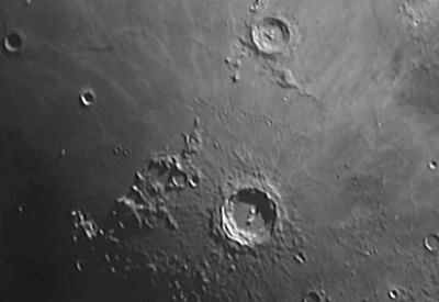 20.4.2013 - Kopernikus und der Doppelkrater Fauth (oben) und Krater Gay-Lassac unten mit der Logitech Webcam am Newton 203/1860, Okularprojektion mit 16 mm Okular - bearbeitet mit Autostakkert, Fitswork (Histogramm) und Giotto (geschärft) |