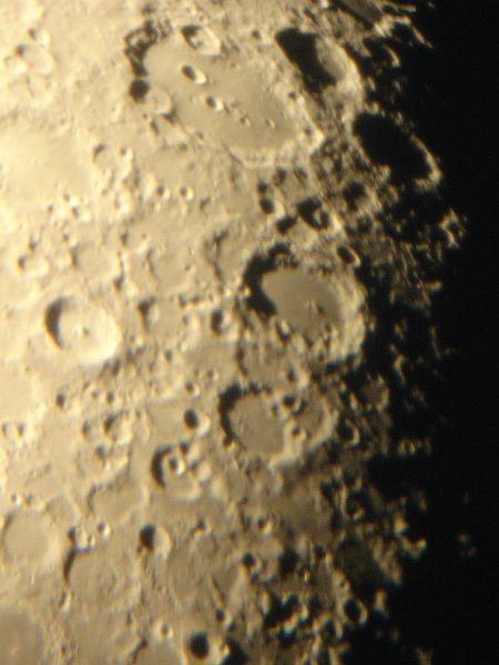 21.4.2013 - Mond am 80/1200 Refraktor, die Sonnenaufnahmen haben mich zu einem Fokalbild mit der Canon gereizt. Mondalter 10,45 Tage. 200 ASA, 1/50 Sekunde |