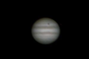 20.12.2013 - Versuche von Jupiteraufnahmen mit dem 120er Newton. Die Sicht ist nicht so schlecht, aber irgendwie fehlt den Bildern die letzte Schärfe. Ich probiere verschiedene Konstellationen aus. Am besten gefällt mir noch die Okularprojektion mit dem 16-o Okular. Auf einmal fällt mir ein kleiner Fleck auf dem Video auf. Erst halte ich es für einen Schmutzpartikel, dann stelle ich fest, das ich einen Mondschatten sehe. Nach kurzer Recherche finde ich das Programm "Calsky" und bekomme heraus, dass der Schatten von Ganymed stammt. Zum ersten Mal habe ich jetzt eine Sonnenfinsternis auf dem Jupiter gesehen. Parallel beobachte ich dazu im Dobson und bin überrascht, wie schnell sich der Schatten fortbewegt. |