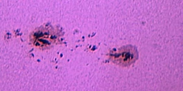 7.4.2013 - Die Sonne aufgenommen mit 50/540 und Kompaktkamera Sony DCS W1 hinter 25 mm Huygensokular mit Okularsonnenfilter. |