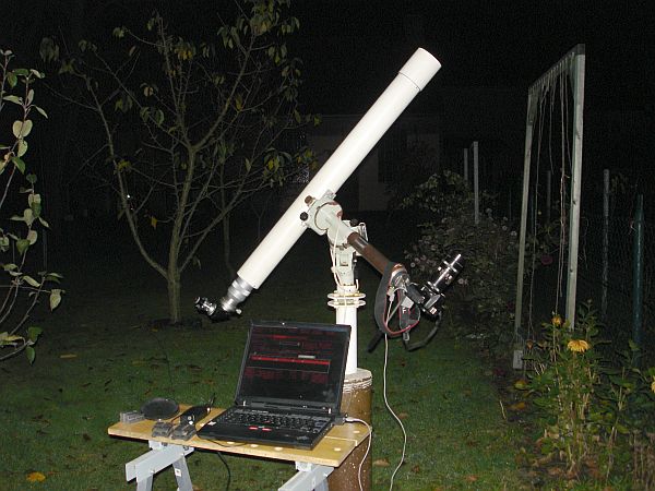 3.11.2013 - wieder trübes Wetter. Ich nehme mir etwas Zeit, um meine mobile Ausrüstung zusammenzustellen. Für die 1b baue ich endlich einen vernünftigen Anschluss für einen Kinokopf auf der Deklinationsachse. Mein altes IBM Notebook lässt sich prima ohne Netzteil an 12 Volt betreiben. Ich löte mir ein Kabel für den Zigarrenanzünder zusammen. Nach einigem Probieren funktioniert auch Astrojan Tools endlich. Ohne Virenscanner ist die Geschwindigkeit des Notebooks für den Zweck ausreichend und es hat eine beleuchtete Tastatur. Abends dann ein paar Testaufnahmen im Garten: Cirrusnebel |